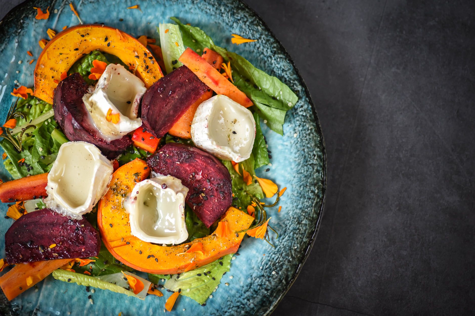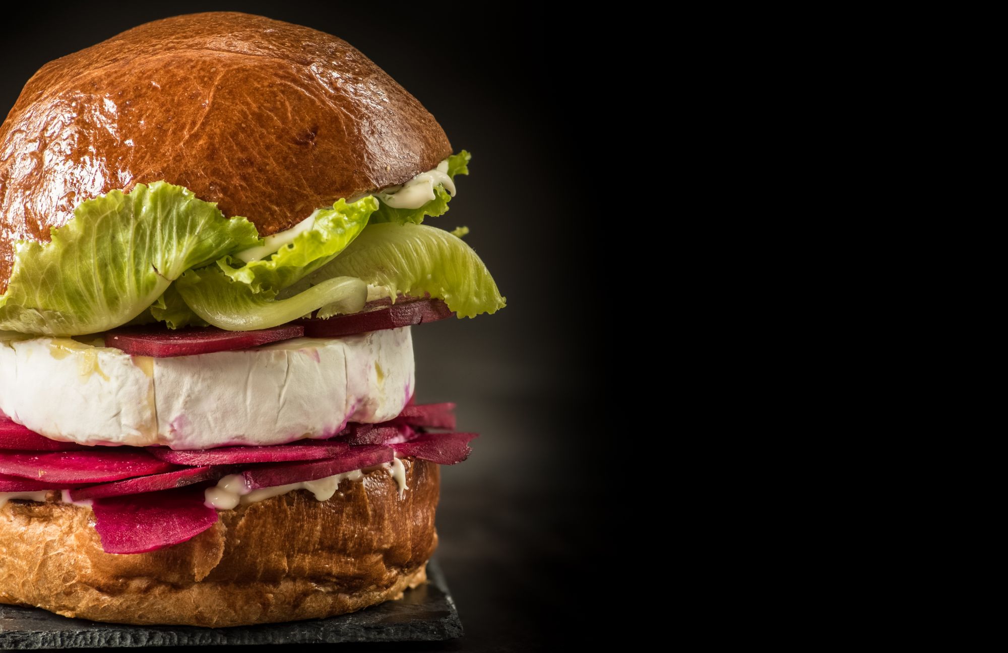 2x 100g bio hovädzie mäso na spôsob smash, cheddar, syr s modrou plesňou, camembert, karamelizovaná cibuľka na červenom víne, hľuzovková mayo, čerstvý rímsky šalát + príloha +omáčka podľa výberu