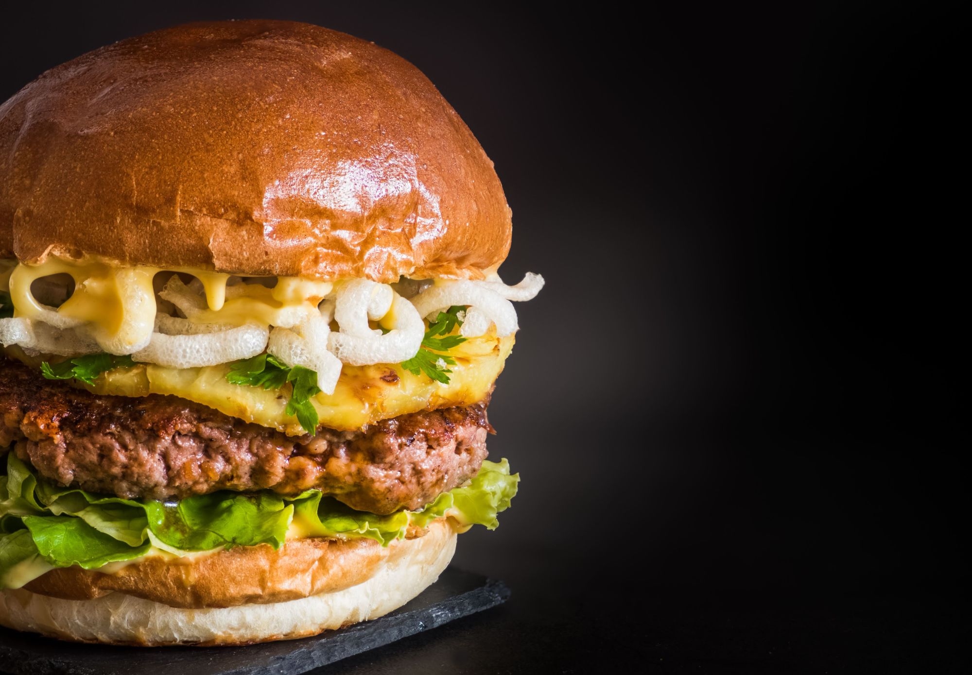 2x 100g bio hovädzie mäso, grilovaný kel marinovaný v citrónovej šťave, chrumkavá slaninka, karamelizovaná cibuľka, mayo, čerstvý rímsky šalát +príloha + omáčka podľa výberu